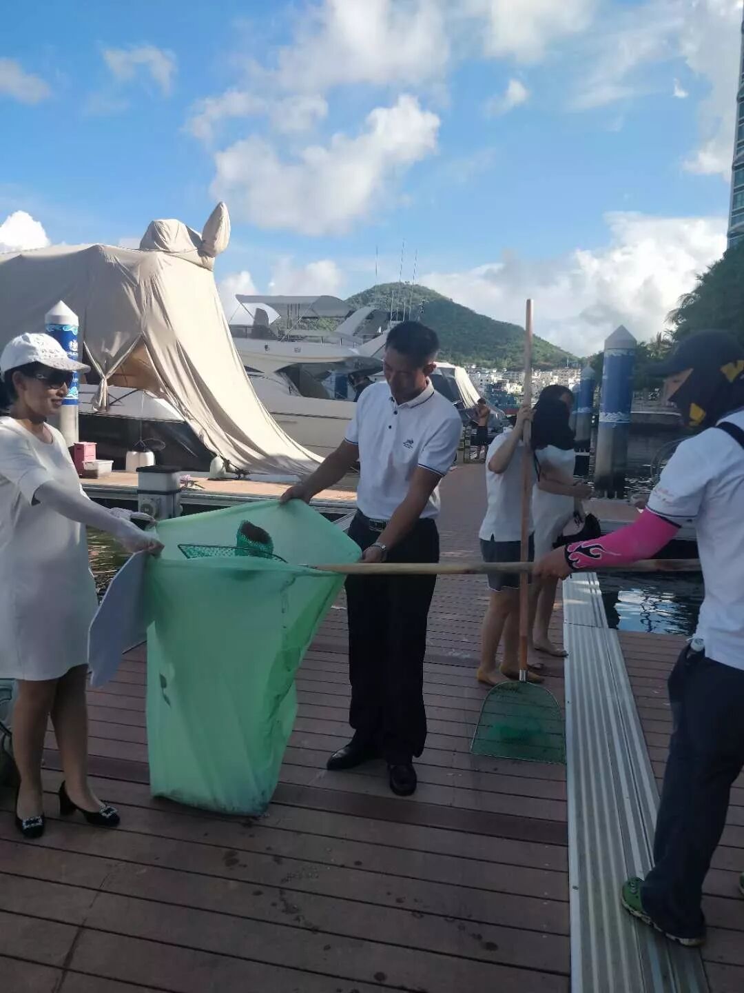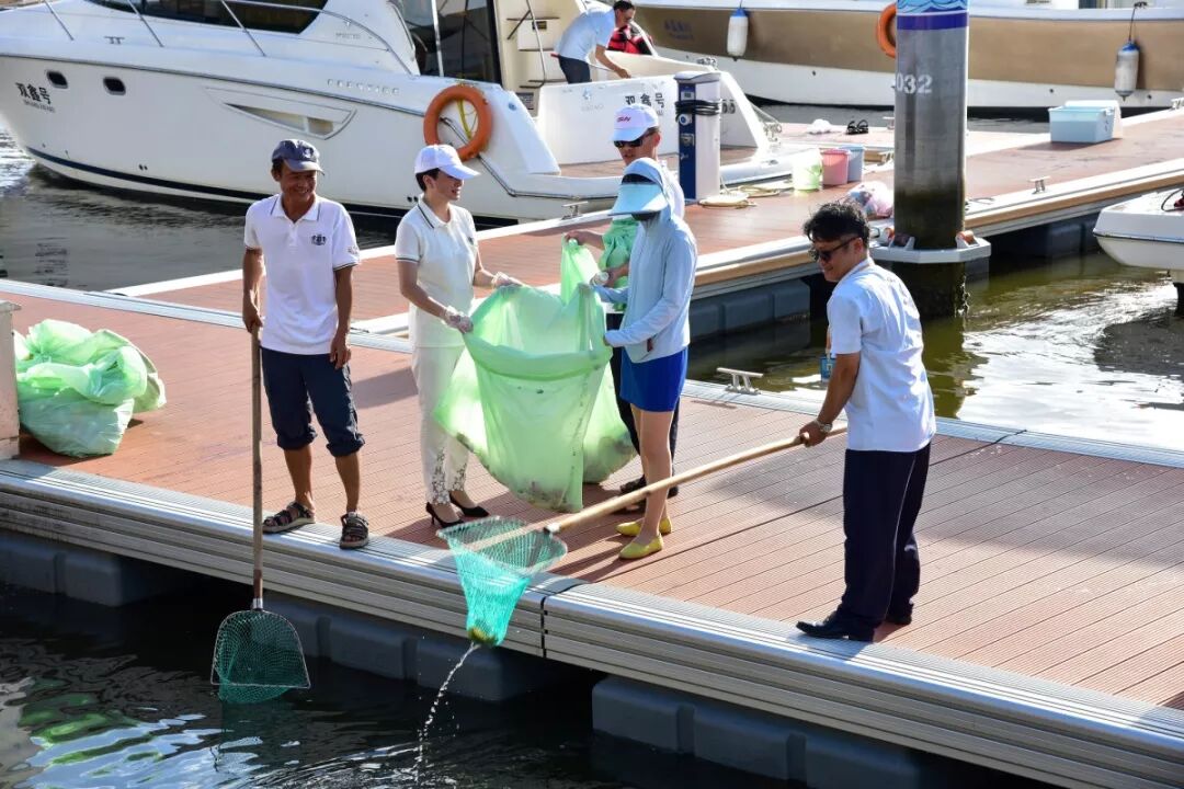 当天下午,三亚鸿洲国际游艇会组织近40名员工开展了以“蔚蓝大海,由我守护”为主题的港池垃圾清理活动。