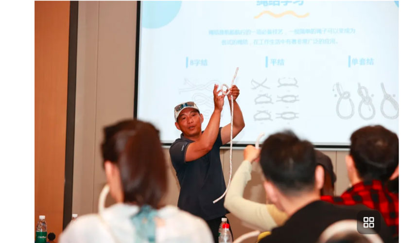 绳结练习环节格外有趣。教练耐心演示了八字结、平结、单套结等多种常用航海绳结的打法。随后“小小航海学者”们手指翻飞,反复练习每一个绳结的打法。一位参与活动的小朋友兴奋地说:“妈妈,看我打的这个8字绳结好看吗?教练叔叔说,这个绳结不仅可以用于帆船上,平时遇到紧急情况也可以用这种方式来打结!等回到学校,我也要把这个方法分享给同学们。”原来航海有这么多学问!以前觉得打个结很简单,今天才知道每一个绳结都关系到航海的安与危。